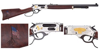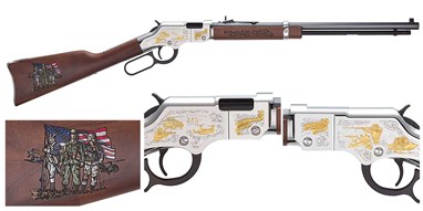 The .45-70 Gov't version was introduced in direct response to customer feedback requesting a larger caliber option for the series. This rifle is chambered in the historic and hard-hitting .45-70 Government. It's no coincidence that Henry chose a cartridge once used by the United States Marine Corps until 1897. It pairs a nickel-plated, hardened brass receiver with 24K gold highlights and upgraded Semi-Fancy American Walnut furniture. The receiver features inscriptions from the Marines’ Hymn, while the buttstock depicts a crowd of hands triumphantly raising the U.S. flag. The MSRP is $2,360. Visit HenryUSA.com for more information.